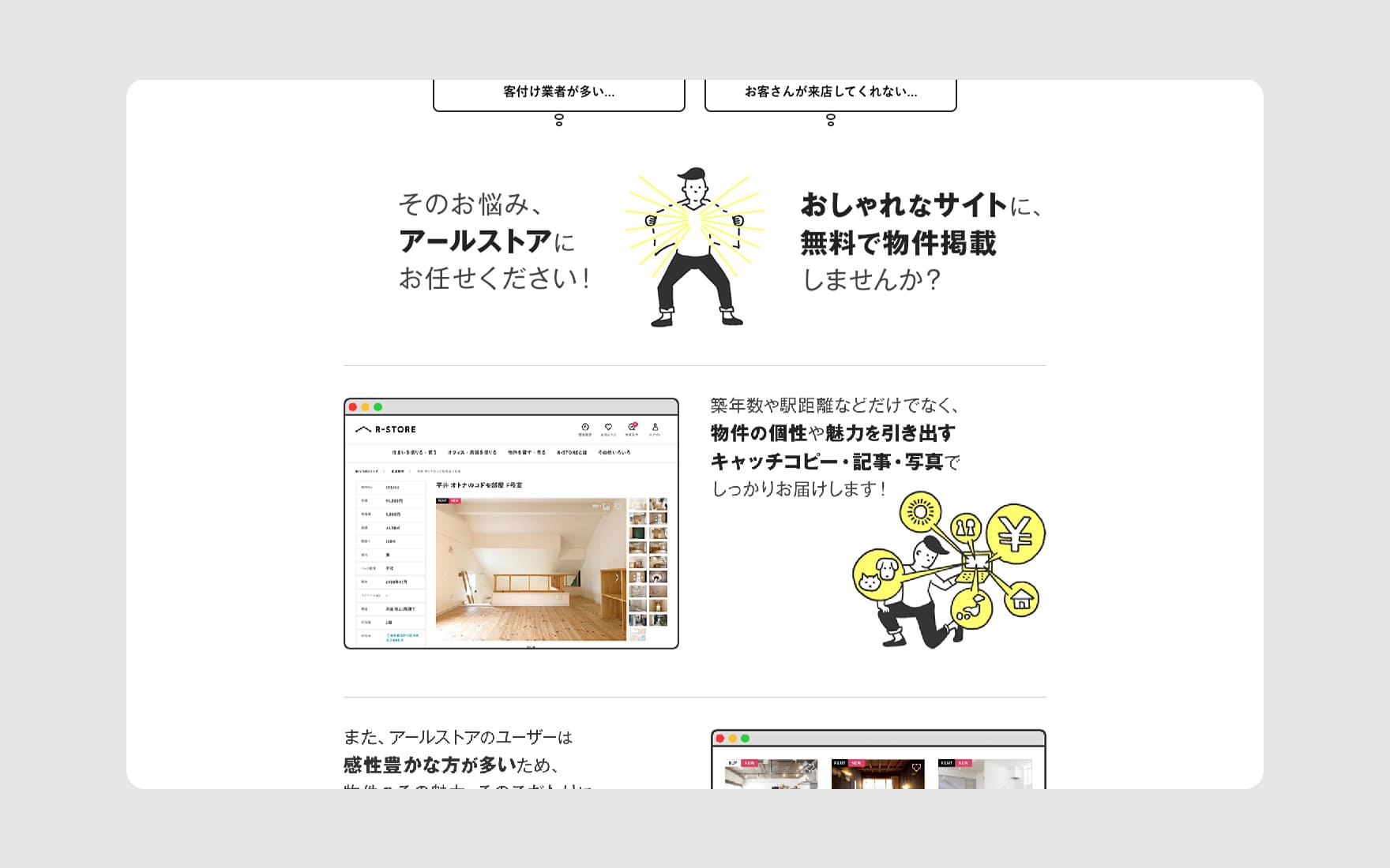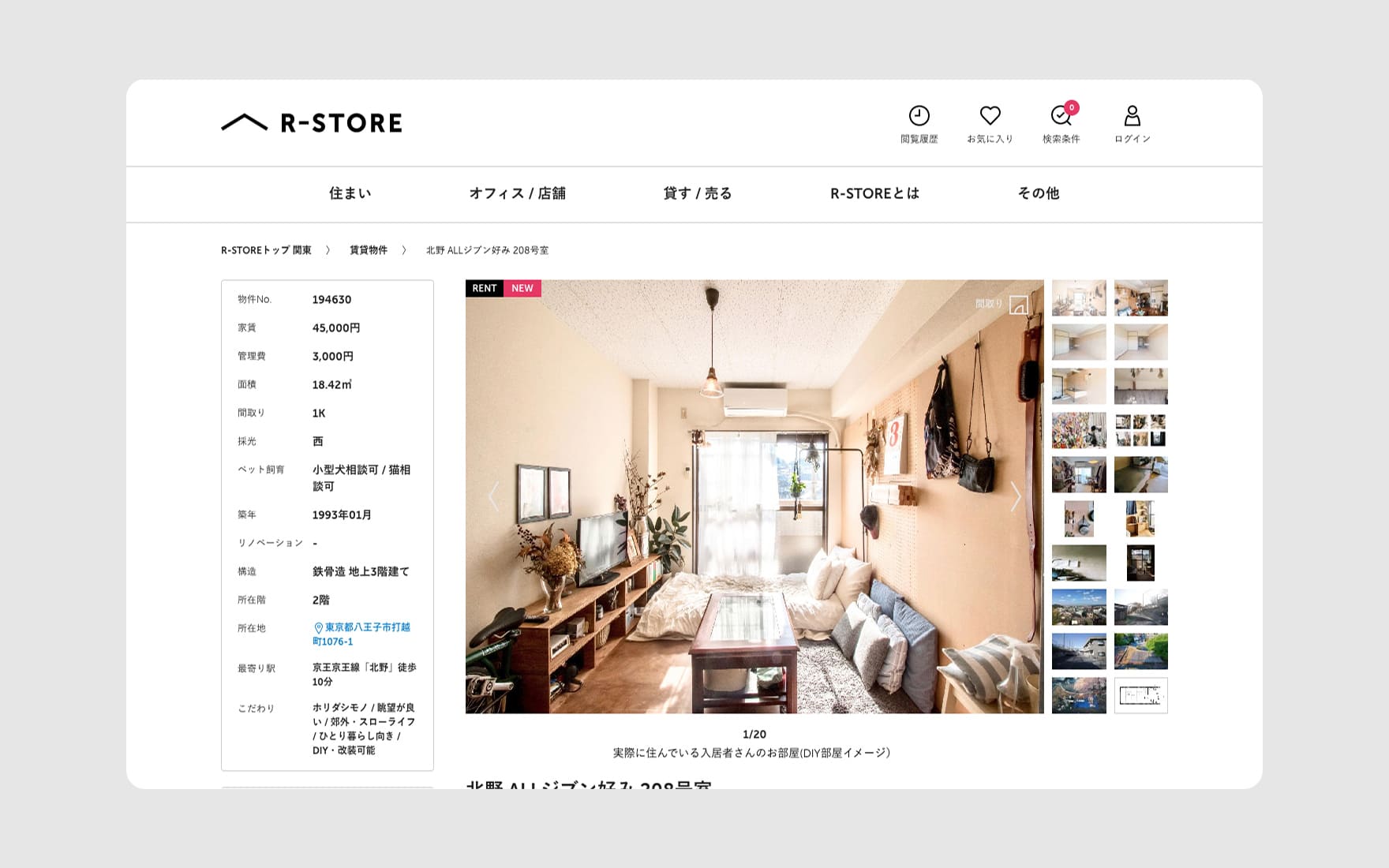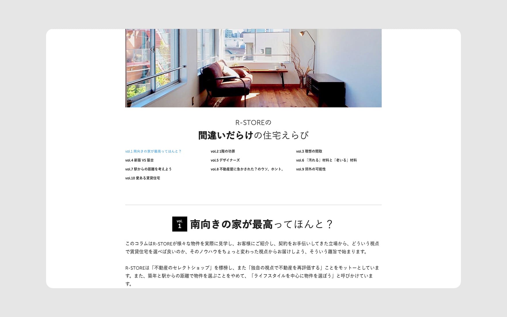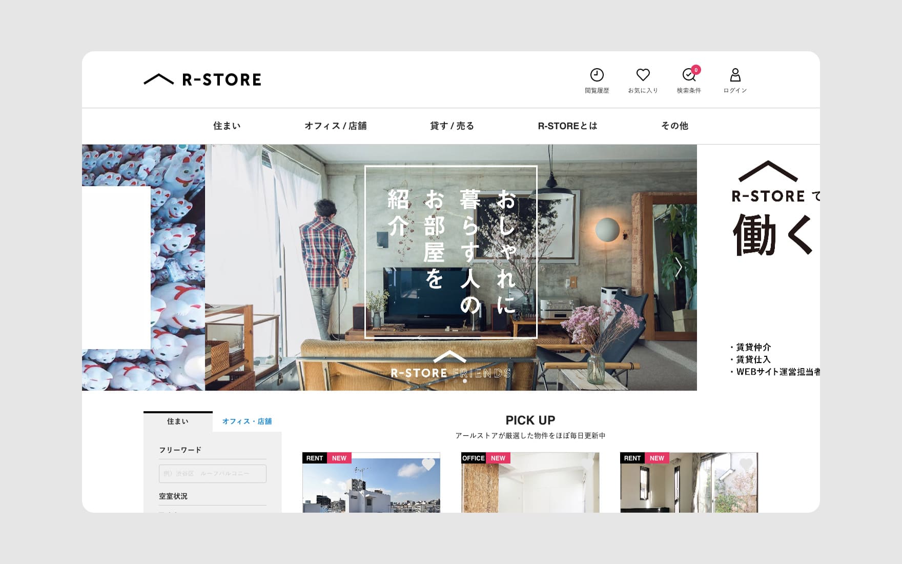 不動産のセレクトショップをコンセプトに、 デザイナーズ・リノベーション・広いバルコニー・DIY可能など、 個性的でこだわりのある 賃貸・売買・事業用物件を紹介しているR-StoreのWebsiteを制作しました。