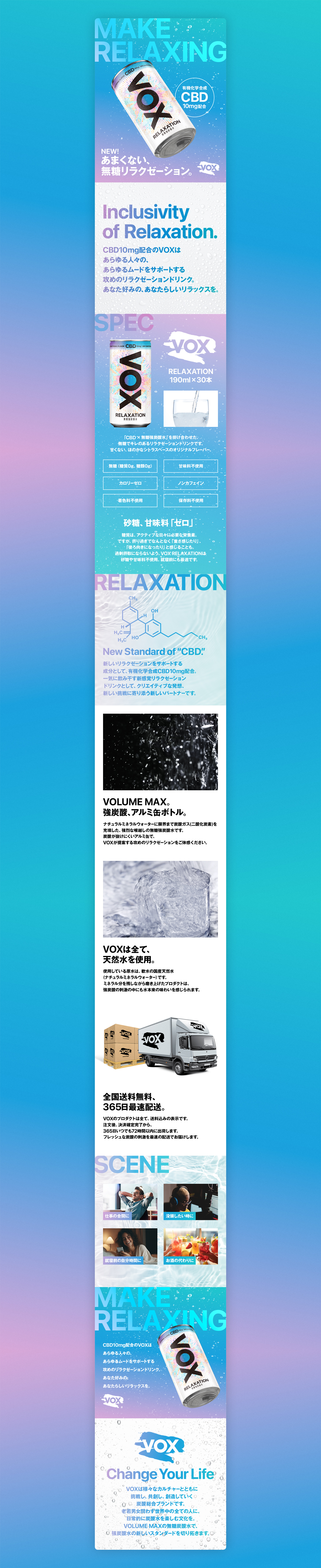 「無糖×強炭酸×CBD」が生む“攻め”のリラクゼーションドリンクVOX RELAXATIONのアートディレクション・デザイン・LP制作を担当しました。